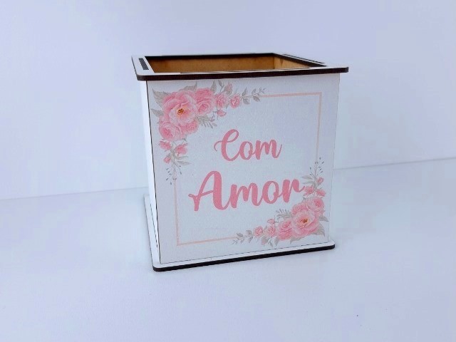 MADEIRA - CUBO/VASO BRANCO C/ FLORES "COM AMOR", 12X12X12CM