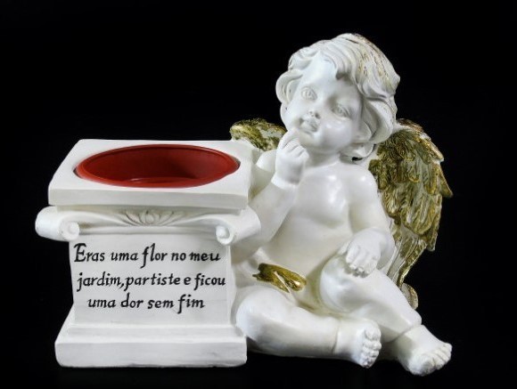 Anjo e Vaso c/ Dizeres, Branco/Ouro, Marfinite - 22cm