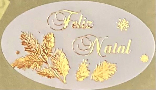 250 ETIQUETAS OVAL BRANCO/OURO, "FELIZ NATAL", RAMO PINHEIRO, 2.5X4.5CM